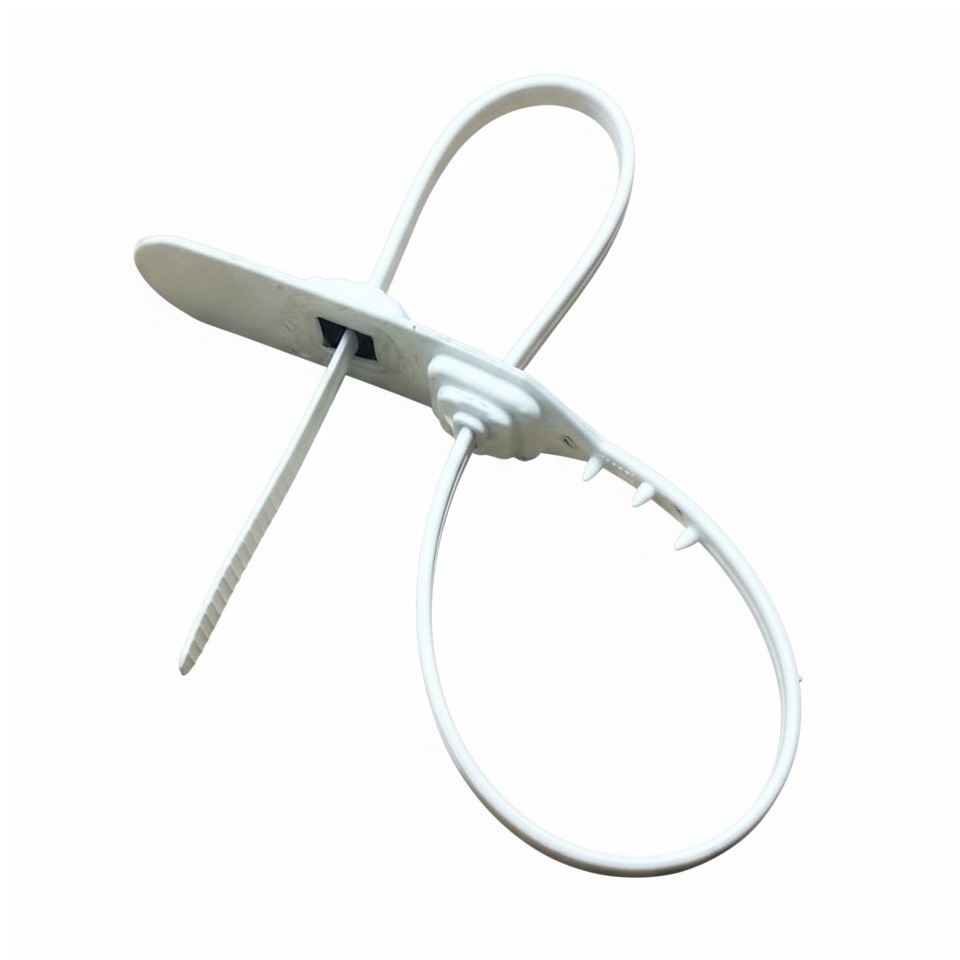 The application process involves passing the strap’s tail through the first lock, looping it around the closure, and then inserting it through the second lock on the opposite end. This ensures maximum grip, a tight fit around closures, and unmistakable tamper evidence if interference occurs.